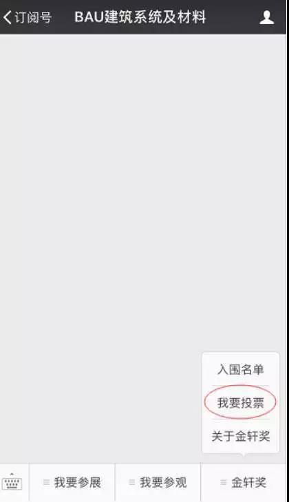 進入微信,找到“BAU建筑系統(tǒng)及材料”點擊右下方“金軒獎-我要投票”欄目進入投票頁面進行投票。
