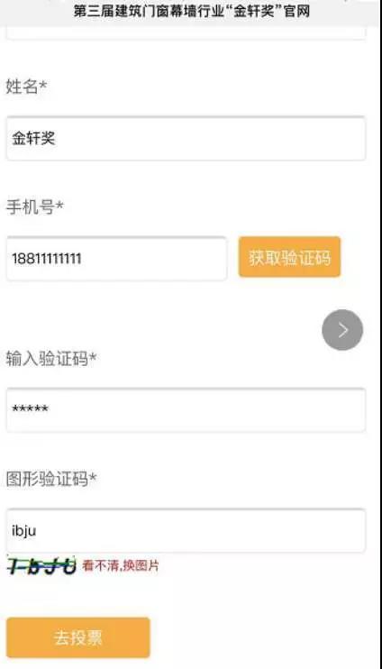 進入投票頁面,彈出實名制個人信息填寫表格——請?zhí)顚懲暾麄€人信息,點擊獲取驗證碼并輸入后提交。