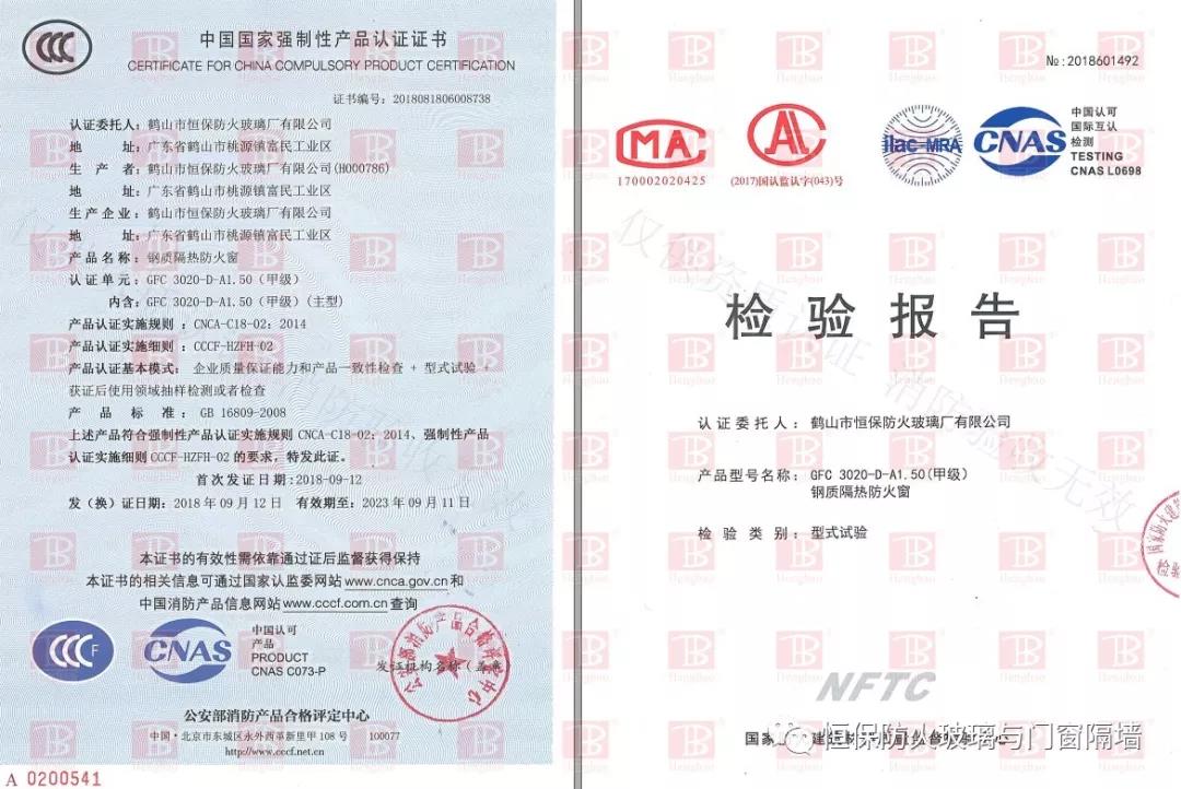 鶴山恒保經過多年努力,終于解決這一行業難題:成功通過超大甲級防火窗國家CCC認證,3000mmX2000mm超大尺寸版面,整窗都能滿足防火完整性和防火隔熱性1.5小時的要求,既符合建筑設計防火規范的要求,又具有窗的通透性,美觀實用。完美解決了地鐵高鐵消防控制室超大甲級防火觀察窗合法化的問題!