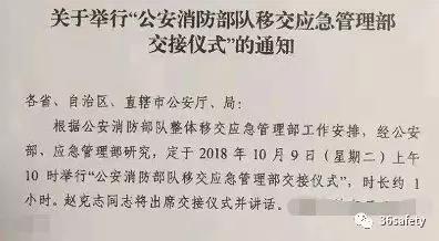 據多家媒體披露,根據公安消防部隊整體移交應急管理部工作安排,經應急管理部、公安部部門研究,定于2018年10月9日(周二)上午10時舉行“公安消防部隊移交應急管理部交接儀式”,時長約1小時,公安部部長趙克志將出席交接儀式并講話,主會場設在公安部機關樓。