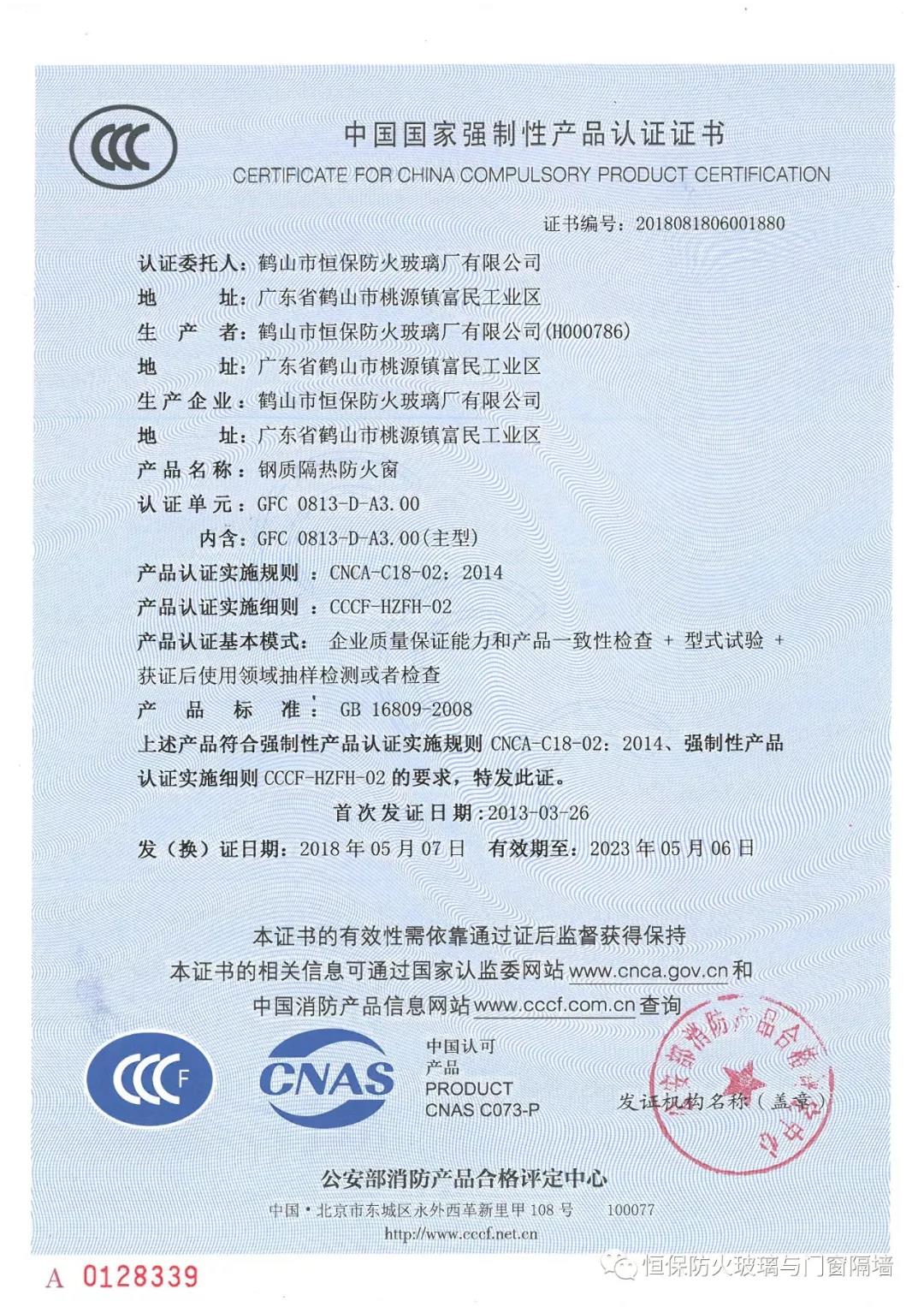 截止2018年10月,已獲得國家“CCCf”主型產品認證證書36張,評定中心網上公告報告55份,四川中心公告26份,天津中心公告2份,英標、歐標、澳標、美標檢驗報告35份評估報告20份,耐火窗等其他性能測試報告16份,恒保公司共獲報告154份涵蓋0.5小時至4小時防火系列產品,并擁有防火玻璃與門窗類專利21項。